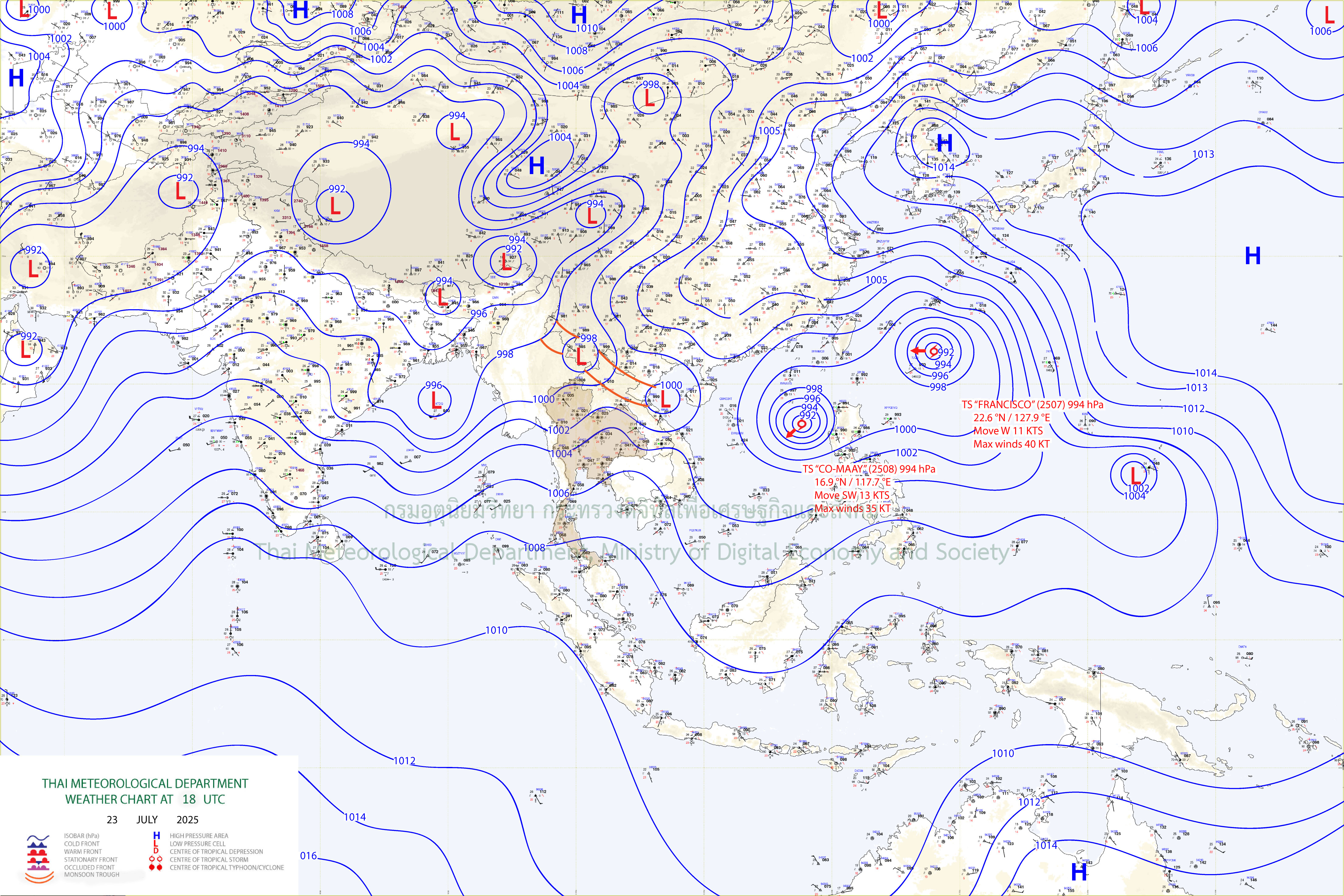 ลักษณะอากาศทั่วไป : พยากรณ์อากาศ 24 ชั่วโมงข้างหน้า ภาคเหนือ และด้านตะวันตกของประเทศไทยตอนบนมีฝนตกหนักมากบางแห่ง โดยเฉพาะบริเวณจังหวัดแม่ฮ่องสอน เชียงใหม่ ตาก และกาญจนบุรี ในขณะที่ประเทศไทยมีฝนตกหนักบางพื้นที่ กับมีลมแรง ขอให้ประชาชนในบริเวณดังกล่าวระวังอันตรายจากฝนตกหนักถึงหนักมากและฝนที่ตกสะสม ซึ่งอาจทำให้เกิดน้ำท่วมฉับพลัน น้ำป่าไหลหลาก และน้ำล้นตลิ่ง โดยเฉพาะพื้นที่ลาดเชิงเขาใกล้ทางน้ำไหลผ่านและพื้นที่ลุ่ม ทั้งนี้เนื่องจากมีหย่อมความกดอากาศต่ำบริเวณประเทศเมียนมา และแนวร่องมรสุมที่พาดผ่านตอนบนของภาคเหนือ ประเทศลาวตอนบน เข้าสู่หย่อมความกดอากาศต่ำบริเวณประเทศเวียดนามตอนบน ในขณะที่มรสุมตะวันตกเฉียงใต้กำลังแรงพัดปกคลุมทะเลอันดามัน ประเทศไทย และอ่าวไทย สำหรับคลื่นลมบริเวณทะเลอันดามันตอนบน และอ่าวไทยตอนบนมีกำลังค่อนข้างแรง โดยมีคลื่นสูง 2-3 เมตร บริเวณที่มีฝนฟ้าคะนองคลื่นสูงมากกว่า 3 เมตร ส่วนทะเลอันดามันตอนล่างมีคลื่นสูงประมาณ 2 เมตร บริเวณที่มีฝนฟ้าคะนองคลื่นสูงมากกว่า 2 เมตร ขอให้ชาวเรือบริเวณทะเลอันดามันและอ่าวไทยเดินเรือด้วยความระมัดระวังและหลีกเลี่ยงการเดินเรือในบริเวณที่มีฝนฟ้าคะนอง ส่วนเรือเล็กบริเวณทะเลอันดามันตอนบนและอ่าวไทยตอนบนควรงดออกจากฝั่ง