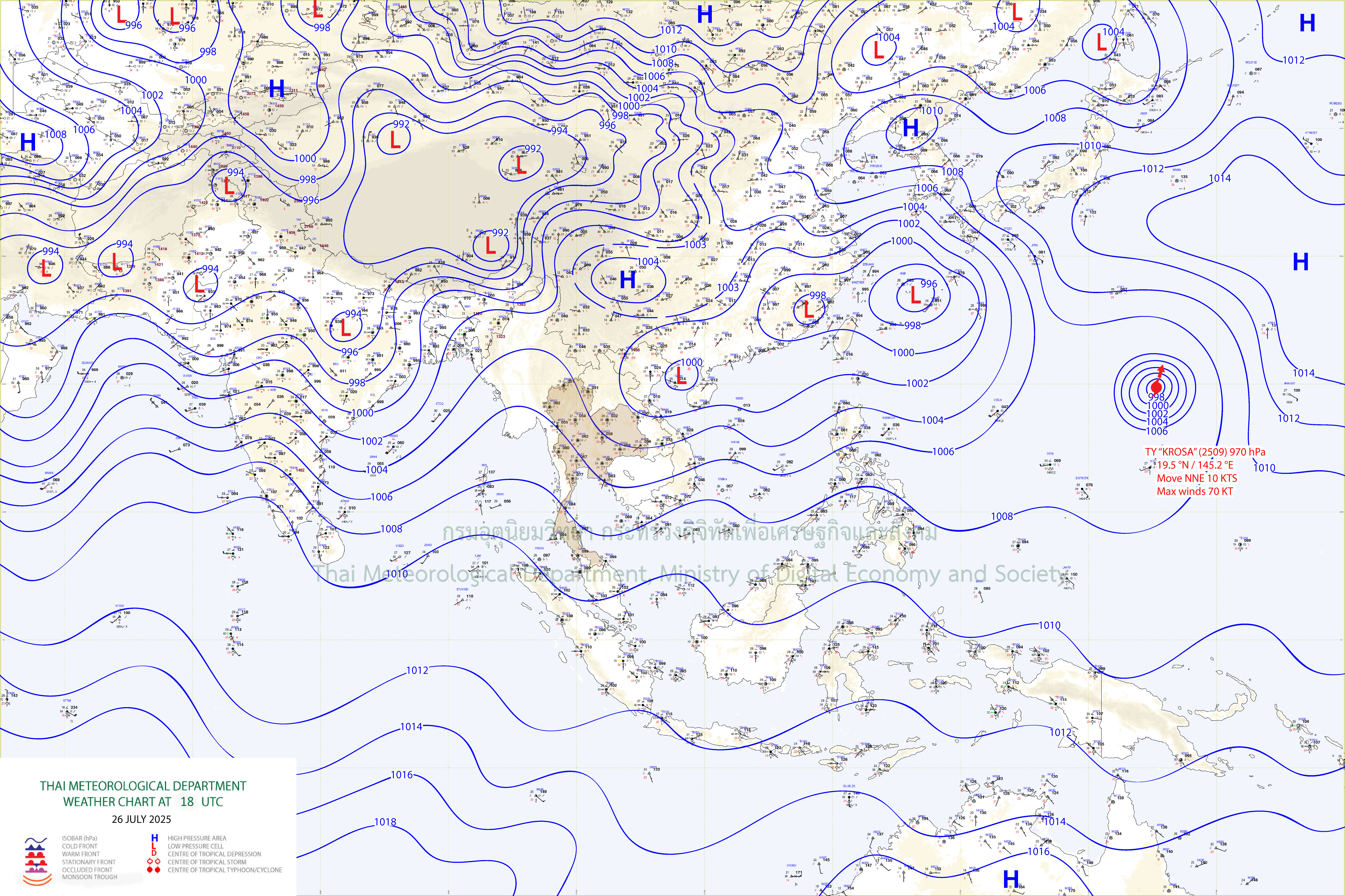 ลักษณะอากาศทั่วไป : พยากรณ์อากาศ 24 ชั่วโมงข้างหน้า ประเทศไทยตอนบนยังคงมีฝนตกหนักบางแห่ง และมีฝนตกหนักมากบางพื้นที่ในภาคเหนือและภาคตะวันออกเฉียงเหนือ โดยเฉพาะบริเวณจังหวัดเชียงราย พะเยา น่าน หนองคาย บึงกาฬ อุดรธานี สกลนคร และนครพนม ขอให้ประชาชนในบริเวณดังกล่าวระวังอันตรายจากฝนตกหนักถึงหนักมากและฝนที่ตกสะสมซึ่งอาจทำให้เกิดน้ำท่วมฉับพลัน น้ำป่าไหลหลาก และน้ำล้นตลิ่ง โดยเฉพาะพื้นที่ลาดเชิงเขาใกล้ทางน้ำไหลผ่านและพื้นที่ลุ่ม ทั้งนี้เนื่องจากมรสุมตะวันตกเฉียงใต้กำลังปานกลางพัดปกคลุมทะเลอันดามัน ประเทศไทย และอ่าวไทย ประกอบกับมีหย่อมความกดอากาศต่ำปกคลุมบริเวณชายฝั่งประเทศเวียดนามตอนบน และอ่าวตังเกี๋ย สำหรับคลื่นลมบริเวณทะเลอันดามันตอนบน และอ่าวไทยตอนบนมีกำลังปานกลาง โดยมีคลื่นสูงประมาณ 2 เมตร บริเวณที่มีฝนฟ้าคะนองคลื่นสูงมากกว่า 2 เมตร ส่วนทะเลอันดามันตอนล่างมีคลื่นสูง 1 - 2 เมตร บริเวณที่มีฝนฟ้าคะนองคลื่นสูงมากกว่า 2 เมตร ขอให้ชาวเรือบริเวณทะเลอันดามันและอ่าวไทยเดินเรือด้วยความระมัดระวังและหลีกเลี่ยงการเดินเรือในบริเวณที่มีฝนฟ้าคะนอง