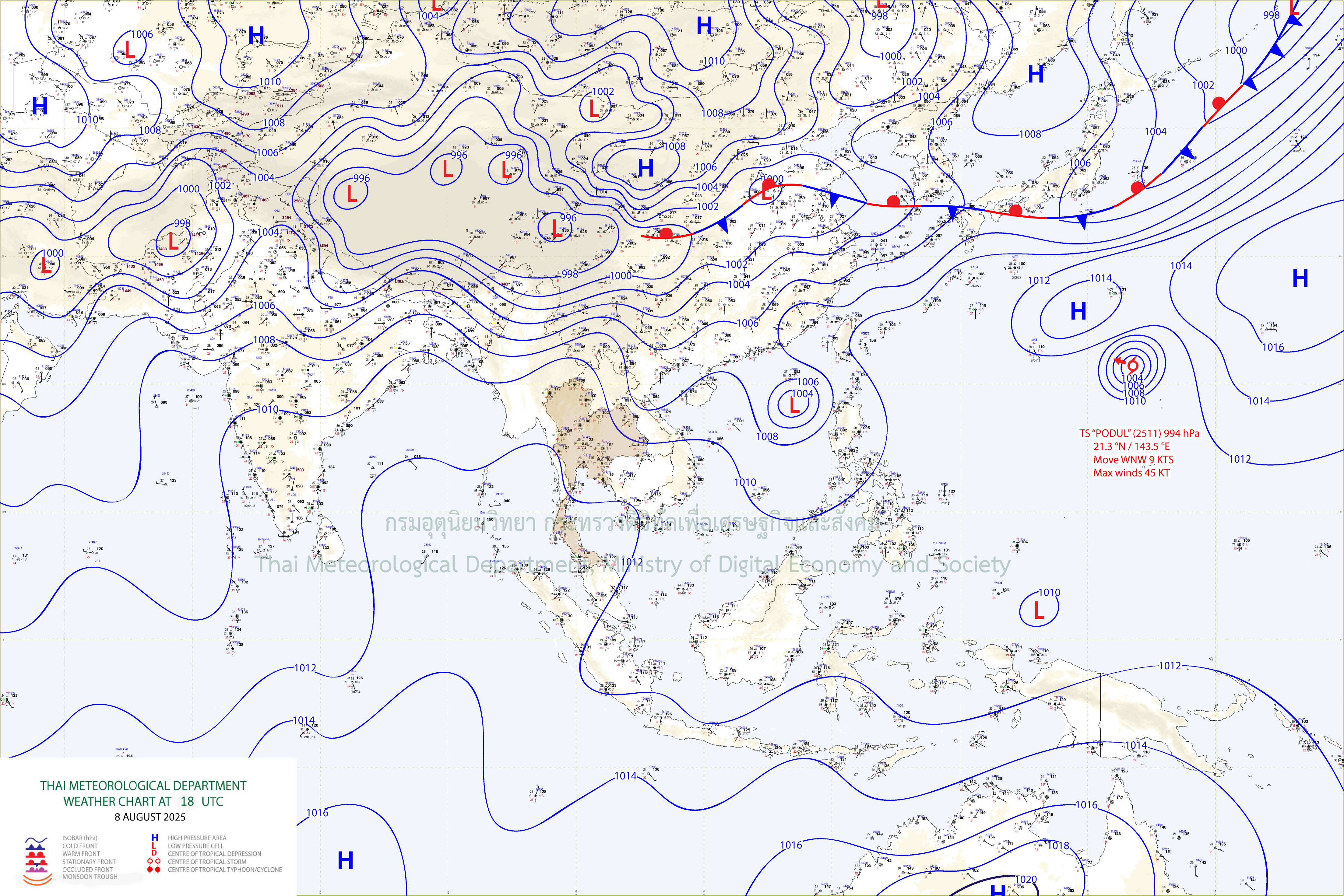 ลักษณะอากาศทั่วไป : พยากรณ์อากาศ 24 ชั่วโมงข้างหน้า ประเทศไทยยังคงมีฝนฟ้าคะนองเกิดขึ้นได้ในบางพื้นที่ ขอให้ประชาชนระวังอันตรายจากฝนฟ้าคะนองไว้ด้วย เนื่องจากมรสุมตะวันตกเฉียงใต้พัดปกคลุมทะเลอันดามัน ประเทศไทย และอ่าวไทย สำหรับคลื่นลมบริเวณทะเลอันดามันตอนบนมีกำลังปานกลาง โดยมีคลื่นสูง 1-2 เมตร บริเวณที่มีฝนฟ้าคะนองคลื่นสูงมากกว่า 2 เมตร ขอให้ชาวเรือบริเวณทะเลอันดามันและอ่าวไทยเดินเรือด้วยความระมัดระวัง และหลีกเลี่ยงการเดินเรือในบริเวณที่มีฝนฟ้าคะนองไว้ด้วย อนึ่ง ในช่วงวันที่ 10 - 15 ส.ค. ประเทศไทยจะมีฝนเพิ่มขึ้น และมีฝนตกหนักบางแห่ง โดยมีฝนตกหนักมากบางพื้นที่ในภาคตะวันออก และภาคใต้ฝั่งตะวันตก เนื่องจากจะมีร่องมรสุมพาดผ่านภาคเหนือ และภาคตะวันออกเฉียงเหนือ ประกอบกับมรสุมตะวันตกเฉียงใต้ที่พัดปกคลุมทะเลอันดามัน ประเทศไทย และอ่าวไทยจะมีกำลังแรงขึ้น
