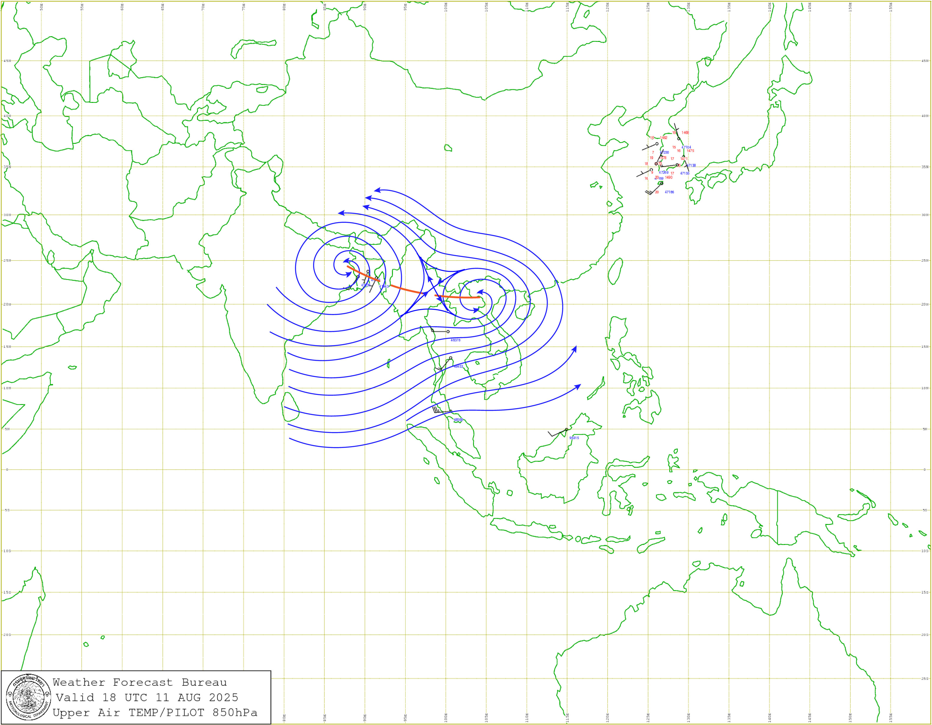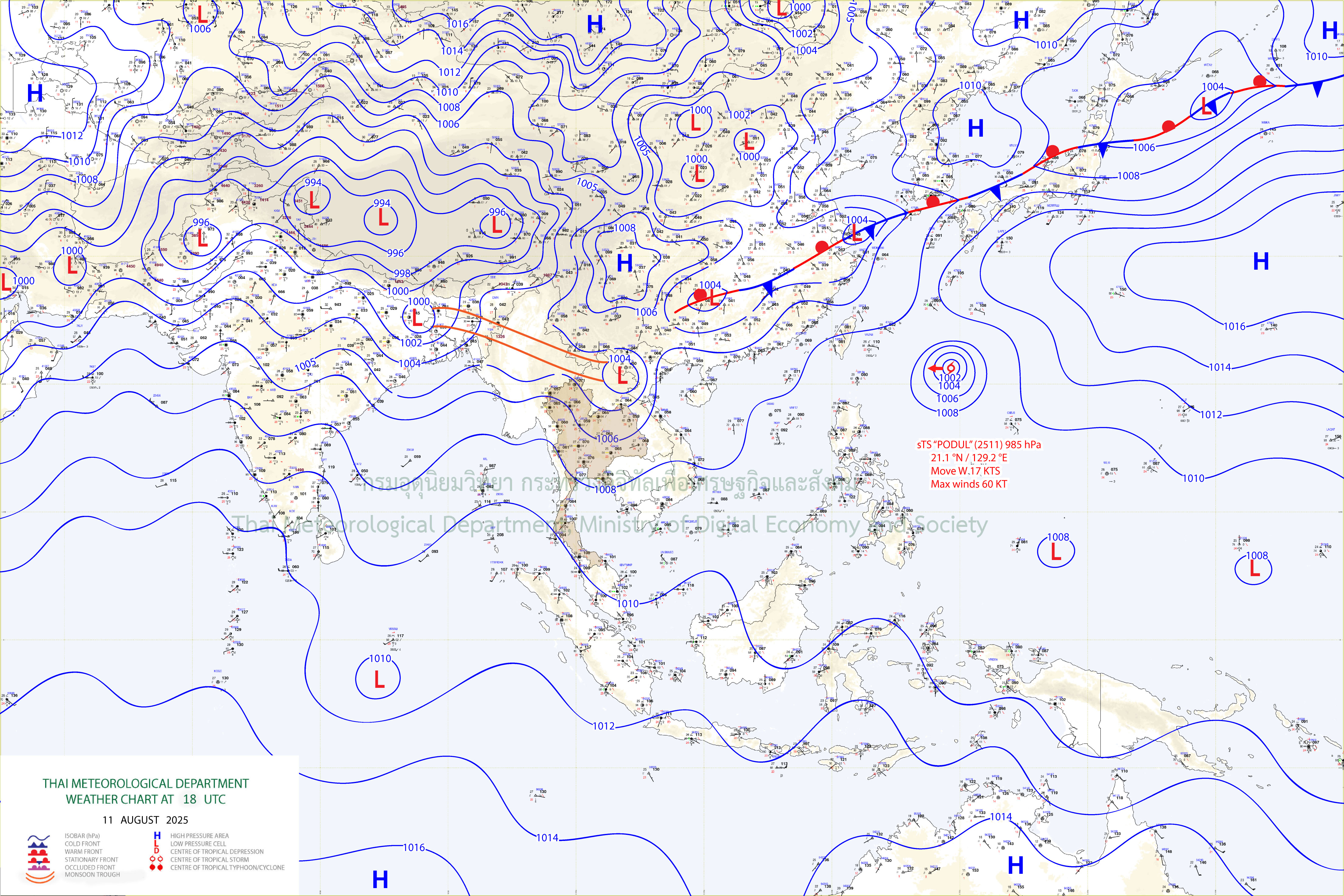 ลักษณะอากาศทั่วไป : พยากรณ์อากาศ 24 ชั่วโมงข้างหน้า ประเทศไทยมีฝนตกหนักบางแห่ง โดยมีฝนตกหนักมากบางพื้นที่บริเวณภาคตะวันออก ขอให้ประชาชนบริเวณประเทศไทยระวังอันตรายจากฝนตกหนักถึงหนักมากและฝนที่ตกสะสม ซึ่งอาจทำให้เกิดน้ำท่วมฉับพลันและน้ำป่าไหลหลาก โดยเฉพาะพื้นที่ลาดเชิงเขาใกล้ทางน้ำไหลผ่านและพื้นที่ลุ่มไว้ด้วย เนื่องจากมีร่องมรสุมพาดผ่านตอนบนของภาคเหนือ ประเทศลาวตอนบน เข้าสู่หย่อมความกดอากาศต่ำบริเวณประเทศเวียดนามตอนบน ประกอบกับมรสุมตะวันตกเฉียงใต้กำลังปานกลางพัดปกคลุมทะเลอันดามัน ประเทศไทย และอ่าวไทย สำหรับคลื่นลมบริเวณทะเลอันดามันและอ่าวไทยตอนบนมีกำลังปานกลาง โดยทะเลอันดามันตอนบนและอ่าวไทยตอนบน มีคลื่นสูงประมาณ 2 เมตร บริเวณที่มีฝนฟ้าคะนองคลื่นสูงมากกว่า 2 เมตร ส่วนทะเลอันดามันตอนล่างมีคลื่นสูง 1 - 2 เมตร บริเวณที่มีฝนฟ้าคะนองคลื่นสูงมากกว่า 2 เมตร ขอให้ชาวเรือบริเวณทะเลอันดามันและอ่าวไทยเดินเรือด้วยความระมัดระวัง และหลีกเลี่ยงการเดินเรือในบริเวณที่มีฝนฟ้าคะนองไว้ด้วย อนึ่ง พายุไต้ฝุ่น “โพดุล” (PODUL) บริเวณมหาสมุทรแปซิฟิก คาดว่าจะเคลื่อนผ่านเกาะไต้หวัน และเคลื่อนขึ้นฝั่งบริเวณด้านตะวันออกของประเทศจีนในช่วงวันที่ 13 – 14 ส.ค. โดยพายุนี้ไม่เคลื่อนเข้าสู่ประเทศไทย