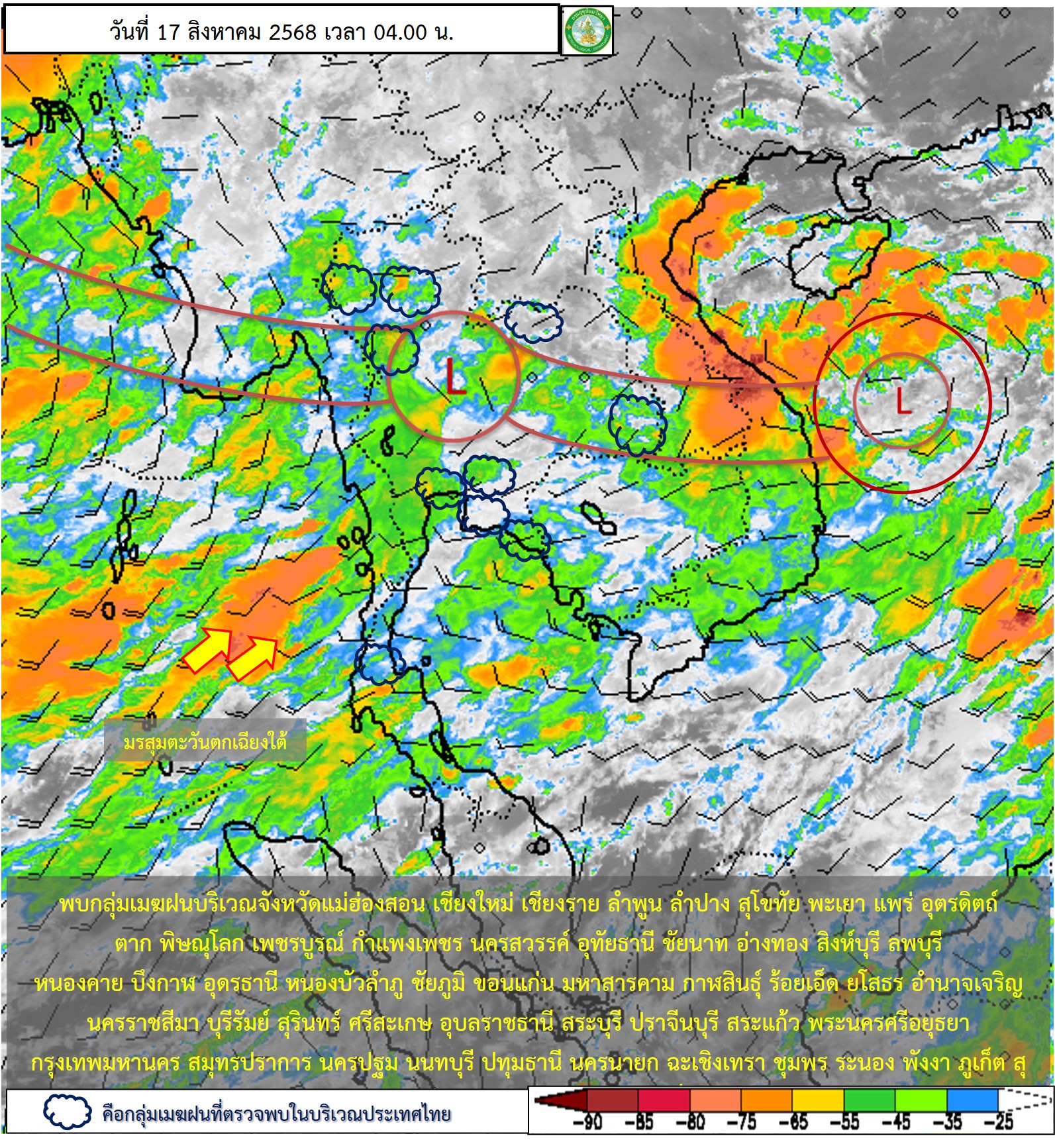 ลักษณะอากาศทั่วไป : พยากรณ์อากาศ 24 ชั่วโมงข้างหน้า ประเทศไทยมีฝนอยู่ในเกณฑ์กระจายถึงเกือบทั่วไปและมีฝนตกหนักบางแห่ง โดยมีฝนตกหนักมากบางพื้นที่ในภาคตะวันออก ขอให้ประชาชนโดยเฉพาะบริเวณจังหวัดแม่ฮ่องสอน ตาก พิษณุโลก เพชรบูรณ์ จันทบุรี และตราด ระวังอันตรายจากฝนตกหนักถึงหนักมากและฝนที่ตกสะสม ซึ่งอาจทำให้เกิดน้ำท่วมฉับพลันและน้ำป่าไหลหลาก โดยเฉพาะพื้นที่ลาดเชิงเขาใกล้ทางน้ำไหลผ่านและพื้นที่ลุ่ม เนื่องจากร่องมรสุมพาดผ่านภาคเหนือตอนล่าง และภาคตะวันออกเฉียงเหนือเข้าสู่หย่อมความกดอากาศต่ำกำลังแรงบริเวณทะเลจีนใต้ตอนบน ประกอบกับมรสุมตะวันตกเฉียงใต้กำลังค่อนข้างแรงพัดปกคลุมทะเลอันดามัน ประเทศไทย และอ่าวไทย สำหรับคลื่นลมบริเวณทะเลอันดามันตอนบนมีกำลังค่อนข้างแรง โดยมีคลื่นสูง 2-3 เมตร บริเวณที่มีฝนฟ้าคะนองคลื่นสูงมากกว่า 3 เมตร ส่วนทะเลอันดามันตอนล่างและอ่าวไทยตอนบนมีคลื่นสูงประมาณ 2 เมตร บริเวณที่มีฝนฟ้าคะนองคลื่นสูงมากกว่า 2 เมตร ขอให้ชาวเรือเดินเรือด้วยความระมัดระวังและหลีกเลี่ยงการเดินเรือในบริเวณที่มีฝนฟ้าคะนอง สำหรับเรือเล็กบริเวณทะเลอันดามันตอนบนควรงดออกจากฝั่งจนถึงวันที่ 17 ส.ค. นี้ไว้ด้วย