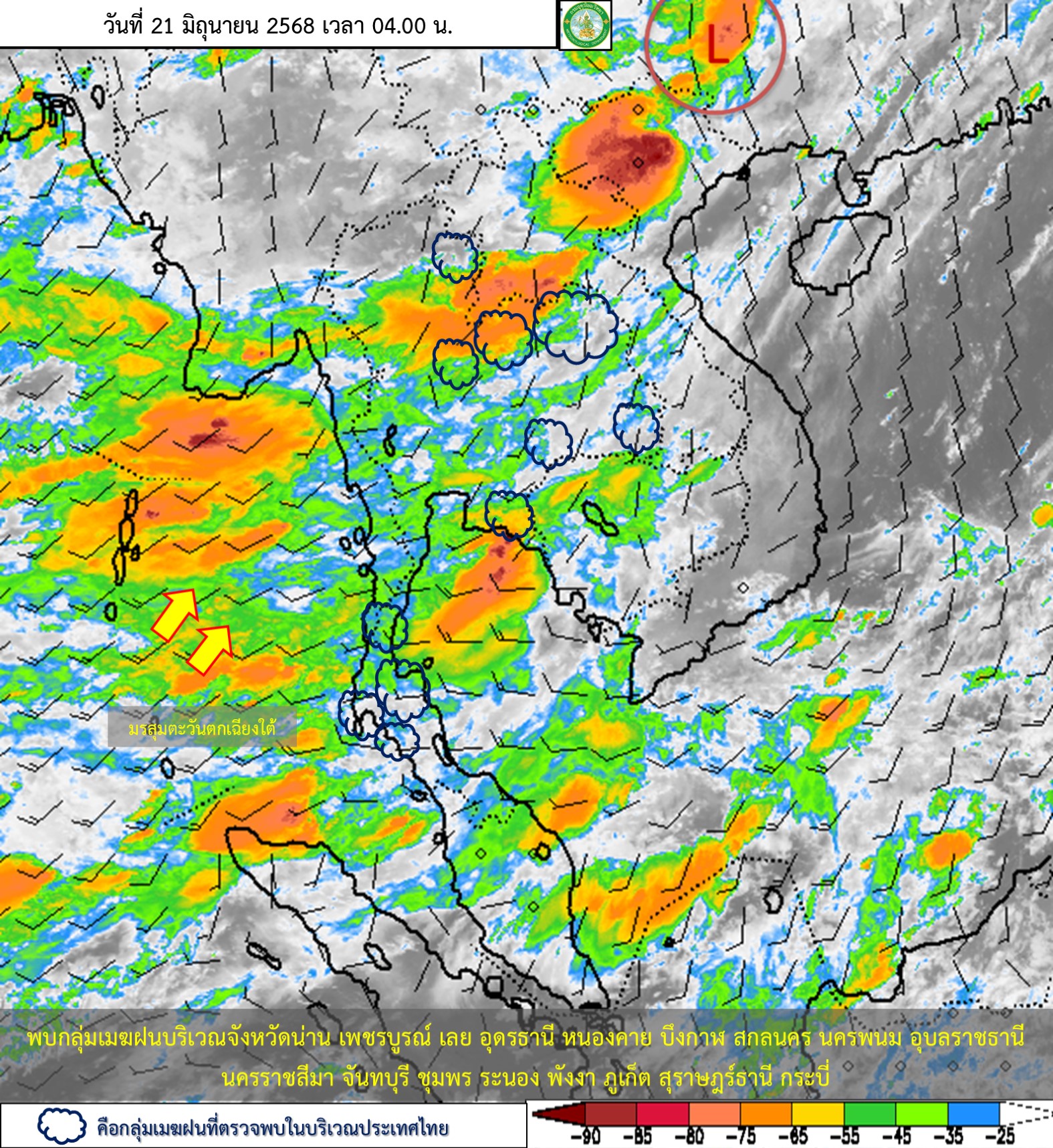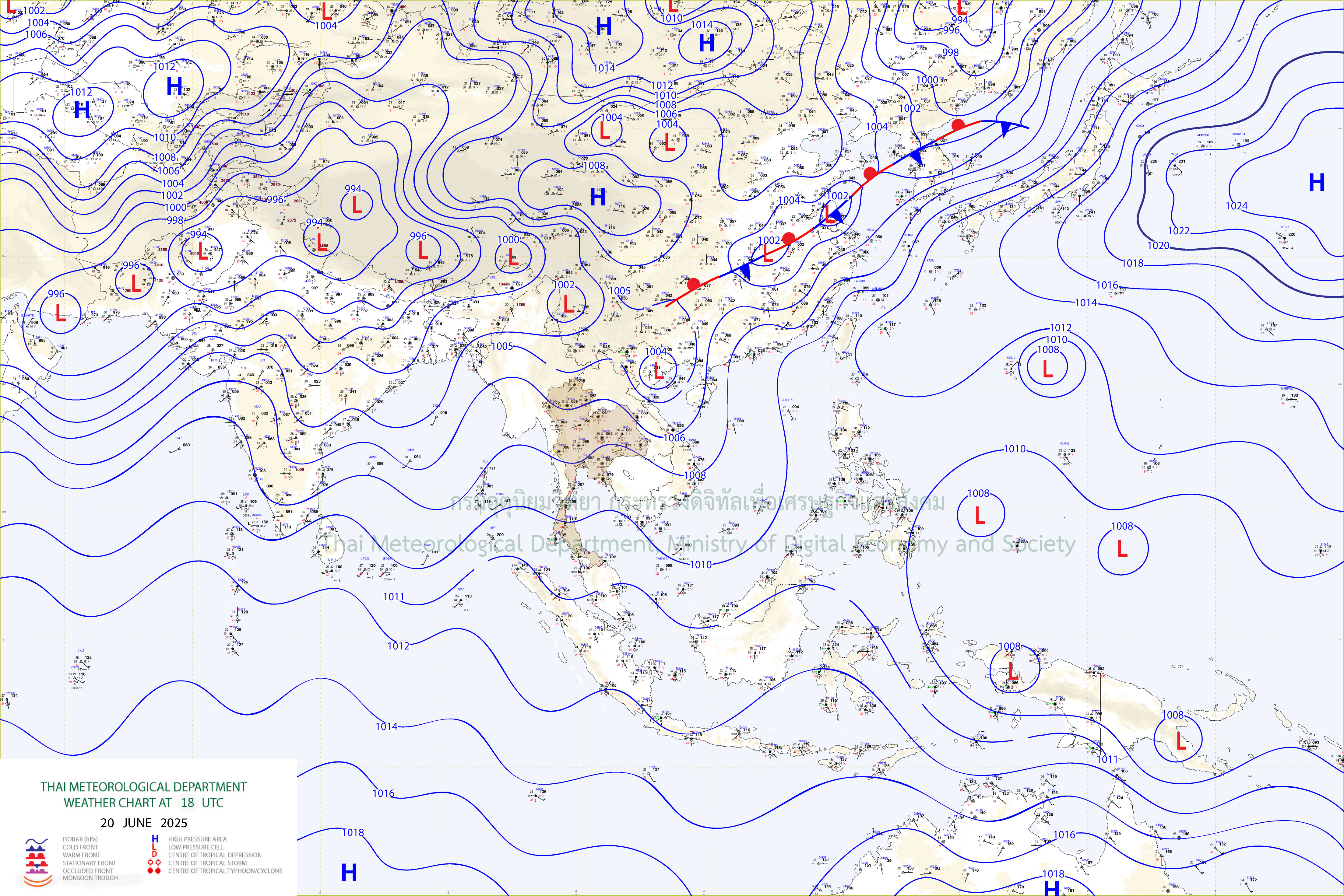 ลักษณะอากาศทั่วไป : พยากรณ์อากาศ 24 ชั่วโมงข้างหน้า ประเทศไทยจะมีฝนเพิ่มขึ้น และมีฝนตกหนักบางแห่งบริเวณภาคเหนือ ภาคตะวันออก และภาคใต้ โดยมีฝนตกหนักมากบางพื้นที่บริเวณภาคตะวันออกเฉียงเหนือ ขอให้ประชาชนบริเวณดังกล่าวระวังอันตรายจากฝนตกหนักและฝนที่ตกสะสม ทั้งนี้เนื่องจากมรสุมตะวันตกเฉียงใต้ที่พัดปกคลุมทะเลอันดามัน ประเทศไทย และอ่าวไทย มีกำลังแรงขึ้น ประกอบกับมีหย่อมความกดอากาศต่ำปกคลุมประเทศเวียดนามตอนบน สำหรับคลื่นลมบริเวณทะเลอันดามันตอนบนและอ่าวไทยตอนบนมีกำลังปานกลาง โดยมีคลื่นสูง 1-2 เมตร บริเวณที่มีฝนฟ้าคะนองคลื่นสูงมากกว่า 2 เมตร ขอให้ชาวเรือบริเวณทะเลอันดามันและอ่าวไทยเดินเรือด้วยความระมัดระวัง และหลีกเลี่ยงการเดินเรือในบริเวณที่มีฝนฟ้าคะนอง