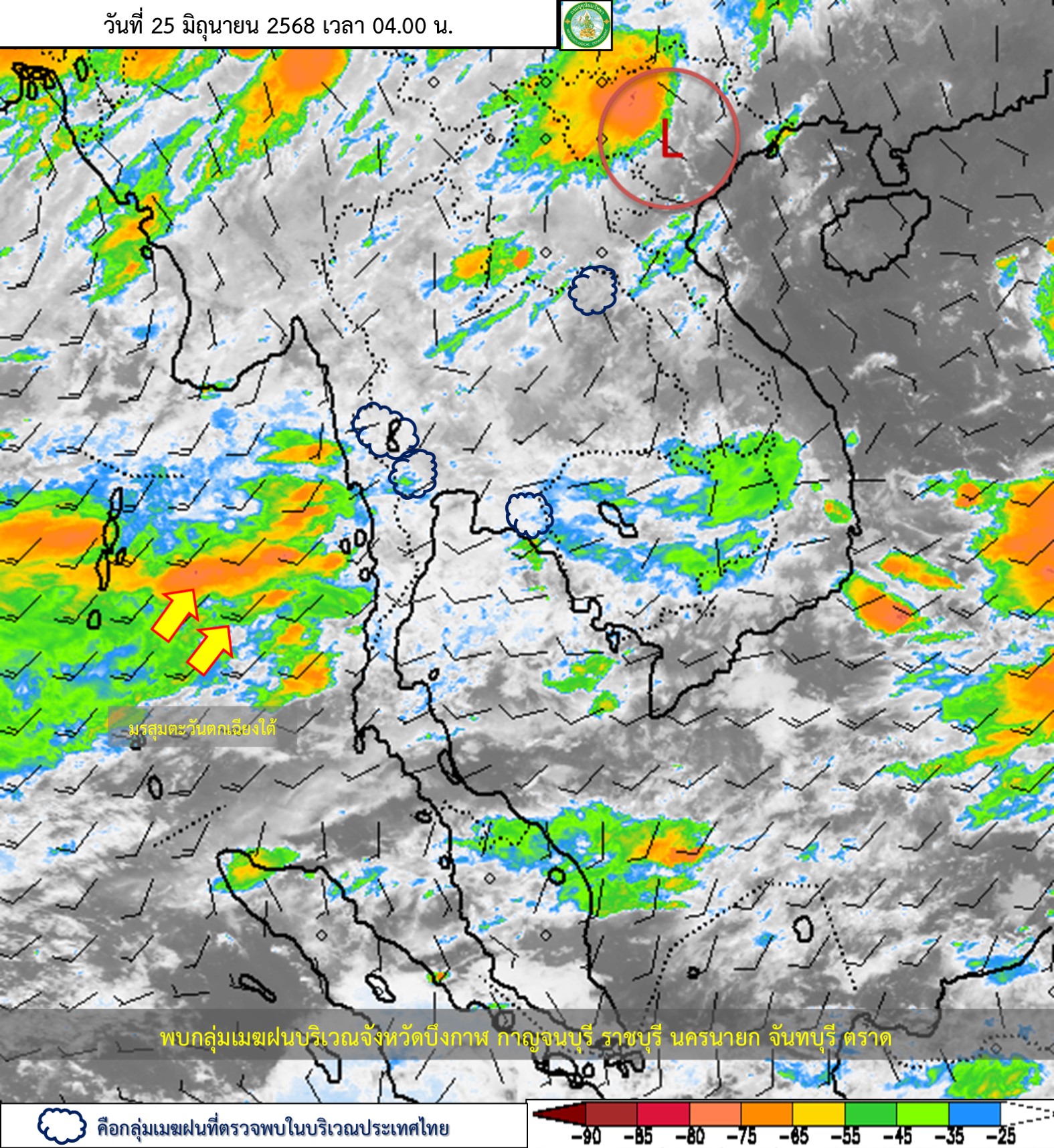 ลักษณะอากาศทั่วไป : พยากรณ์อากาศ 24 ชั่วโมงข้างหน้า ประเทศไทยมีฝนฟ้าคะนองกระจายและมีฝนตกหนักบางแห่งบริเวณภาคเหนือ ภาคตะวันออกเฉียงเหนือตอนบน ภาคตะวันออก และภาคใต้ ขอให้ประชาชนระวังอันตรายจากฝนตกหนักและฝนที่ตกสะสม ซึ่งอาจทำให้เกิดน้ำท่วมฉับพลัน น้ำป่าไหลหลากและดินโคลนถล่ม โดยเฉพาะพื้นที่ลาดเชิงเขาใกล้ทางน้ำไหลผ่านและพื้นที่ลุ่ม ทั้งนี้เนื่องจากมรสุมตะวันตกเฉียงใต้กำลังปานกลางพัดปกคลุมทะเลอันดามัน ประเทศไทย และอ่าวไทย ประกอบกับมีหย่อมความกดอากาศต่ำปกคลุมบริเวณประเทศลาวและเวียดนามตอนบน สำหรับคลื่นลมบริเวณทะเลอันดามันและอ่าวไทยมีกำลังปานกลาง โดยทะเลอันดามันตอนบนมีคลื่นสูงประมาณ 2 เมตร ส่วนทะเลอันดามันตอนล่างและอ่าวไทยตอนบนมีคลื่นสูง 1-2 เมตร บริเวณที่มีฝนฟ้าคะนองคลื่นสูงมากกว่า 2 เมตร ขอให้ชาวเรือบริเวณทะเลอันดามันและอ่าวไทยเดินเรือด้วยความระมัดระวัง และหลีกเลี่ยงการเดินเรือในบริเวณที่มีฝนฟ้าคะนองไว้ด้วย