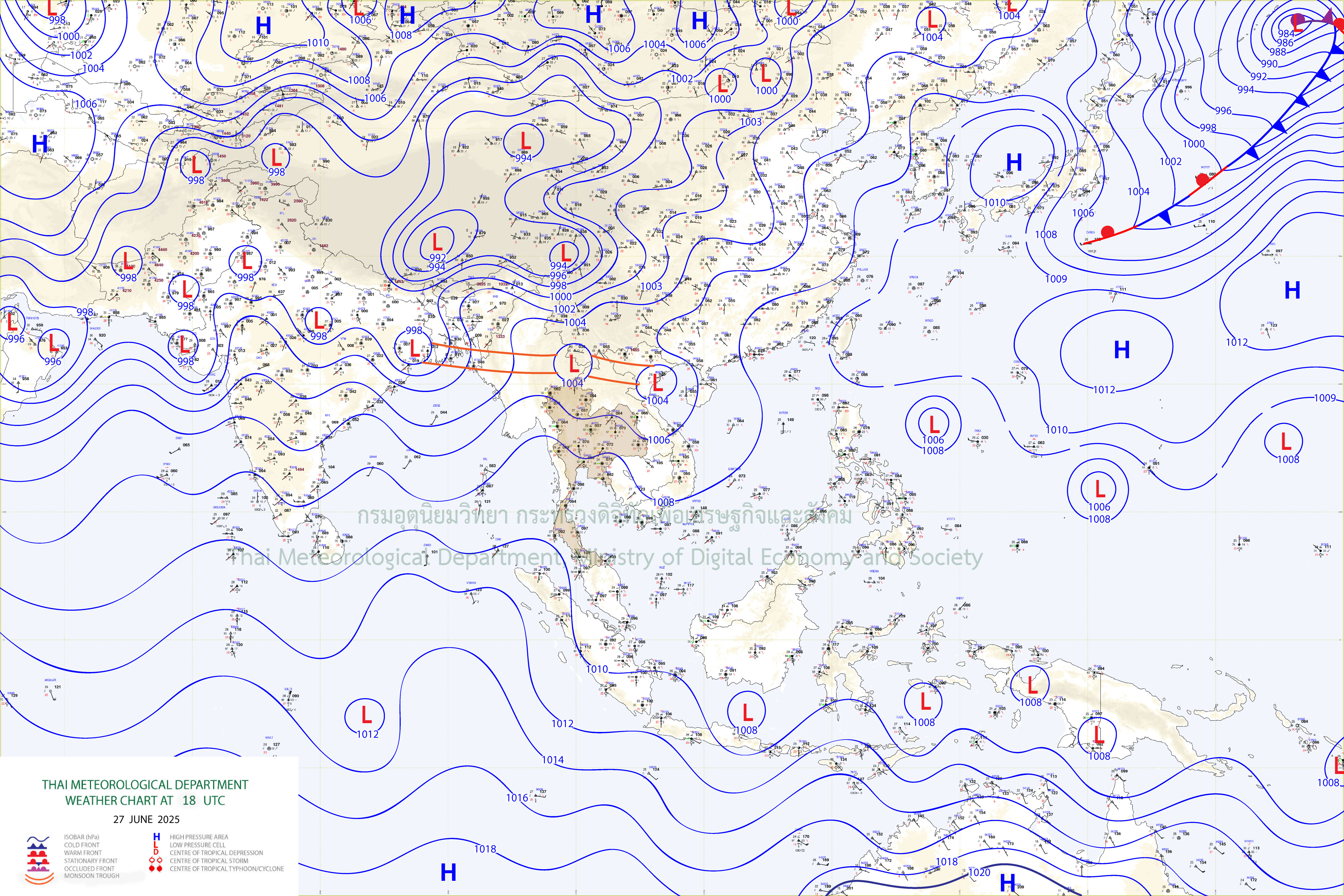 ลักษณะอากาศทั่วไป : พยากรณ์อากาศ 24 ชั่วโมงข้างหน้า ภาคเหนือและภาคตะวันออกเฉียงเหนือมีฝนตกหนักถึงหนักมากบางพื้นที่ ภาคกลางรวมทั้งกรุงเทพมหานครและปริมณฑลและภาคตะวันออกมีฝนตกหนักบางแห่ง ส่วนภาคใต้มีฝนฟ้าคะนองบางพื้นที่ ขอให้ประชาชนบริเวณภาคเหนือบริเวณจังหวัดเชียงรายและน่าน และภาคตะวันออกเฉียงเหนือระวังอันตรายจากฝนตกหนักและฝนที่ตกสะสม ซึ่งอาจทำให้เกิดน้ำท่วมฉับพลันและน้ำป่าไหลหลาก โดยเฉพาะพื้นที่ลาดเชิงเขาใกล้ทางน้ำไหลผ่านและพื้นที่ลุ่ม ทั้งนี้เนื่องจากร่องมรสุมพาดผ่านประเทศเมียนมาตอนบน และตอนบนของภาคเหนือ เข้าสู่หย่อมความกดอากาศต่ำบริเวณประเทศลาวตอนบนและประเทศเวียดนามตอนบน ประกอบกับมรสุมตะวันตกเฉียงใต้ที่พัดปกคลุมทะเลอันดามัน ประเทศไทย และอ่าวไทยมีกำลังปานกลาง