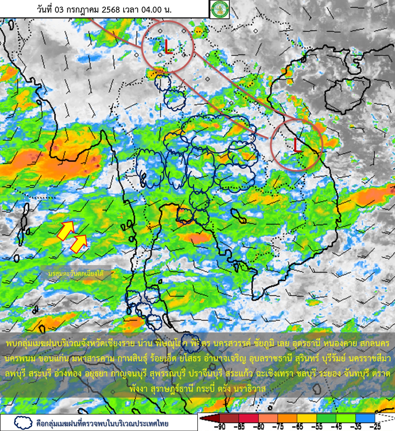 ลักษณะอากาศทั่วไป : พยากรณ์อากาศ 24 ชั่วโมงข้างหน้า บริเวณประเทศไทยมีฝนตกหนักบางแห่ง โดยมีฝนตกหนักมากบางพื้นที่ในภาคเหนือ ภาคตะวันออกเฉียงเหนือตอนบน และภาคตะวันออก ขอให้ประชาชนในบริเวณดังกล่าว โดยเฉพาะบริเวณจังหวัดต่างๆ ตามที่ระบุไว้ในรายภาค ระวังอันตรายจากฝนตกหนักถึงหนักมากและฝนที่ตกสะสม ซึ่งอาจทำให้เกิดน้ำท่วมฉับพลัน น้ำป่าไหลหลากและดินโคลนถล่ม โดยเฉพาะพื้นที่ลาดเชิงเขาใกล้ทางน้ำไหลผ่านและพื้นที่ลุ่ม ทั้งนี้เนื่องจากร่องมรสุมกำลังค่อนข้างแรงพาดผ่านภาคเหนือตอนบนและภาคตะวันออกเฉียงเหนือตอนบน เข้าสู่หย่อมความกดอากาศต่ำบริเวณประเทศลาวตอนล่างและเวียดนามตอนกลาง ประกอบกับมรสุมตะวันตกเฉียงใต้กำลังปานกลางยังคงพัดปกคลุมทะเลอันดามัน ประเทศไทย และอ่าวไทย สำหรับคลื่นลมบริเวณทะเลอันดามันและอ่าวไทยมีกำลังปานกลาง โดยทะเลอันดามันตอนบนมีคลื่นสูงประมาณ 2 เมตร ส่วนทะเลอันดามันตอนล่างและอ่าวไทยตอนบนมีคลื่นสูง 1-2 เมตร บริเวณที่มีฝนฟ้าคะนองคลื่นสูงมากกว่า 2 เมตร ขอให้ชาวเรือบริเวณทะเลอันดามันและอ่าวไทยเดินเรือด้วยความระมัดระวัง และหลีกเลี่ยงการเดินเรือในบริเวณที่มีฝนฟ้าคะนองไว้ด้วย