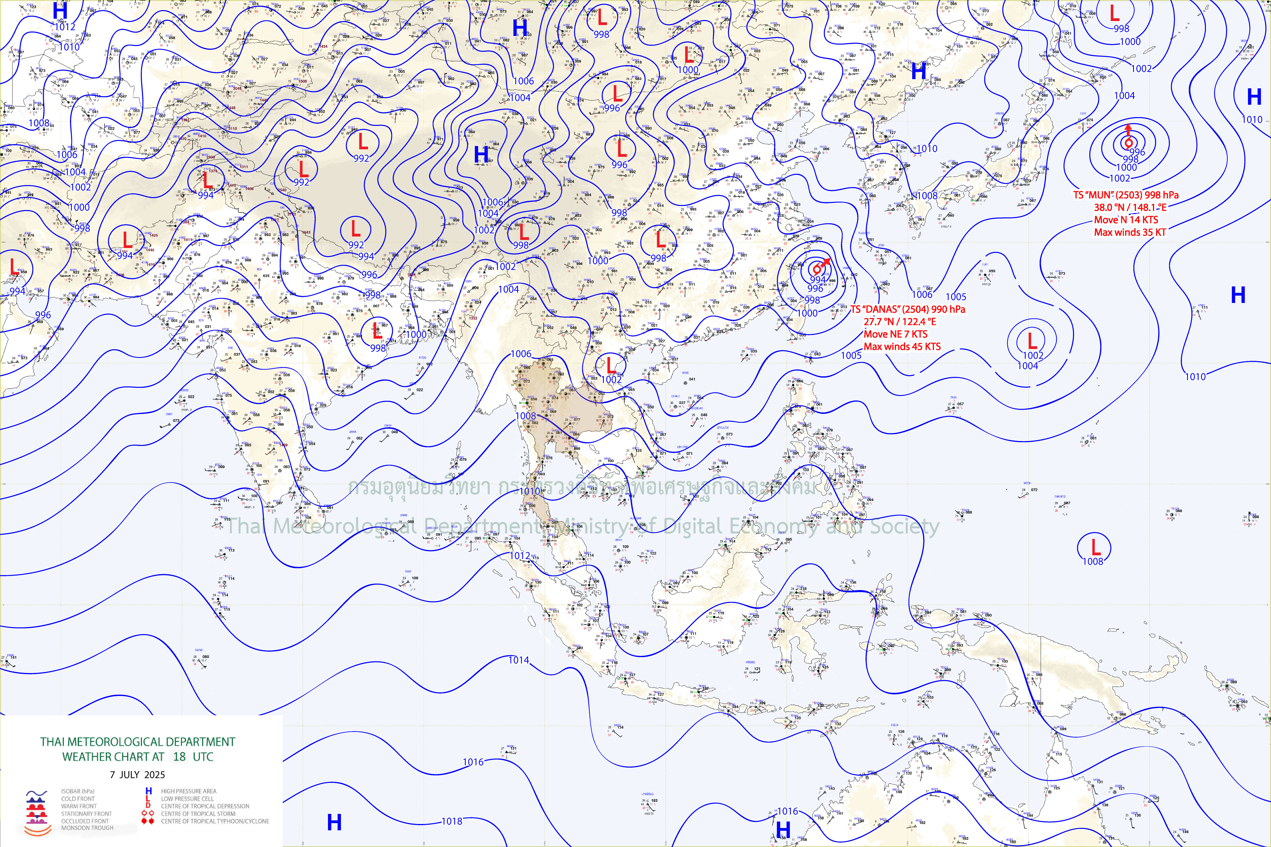 อนึ่ง พายุโซนร้อน “ดานัส” บริเวณทิศเหนือของเกาะไต้หวัน มีแนวโน้มจะเคลื่อนขึ้นฝั่งด้านตะวันออกของประเทศจีนในช่วงวันที่ 8–9 กรกฎาคม 2568 และคาดว่าพายุนี้จะอ่อนกำลังลงเป็นพายุดีเปรสชัน และหย่อมความกดอากาศต่ำกำลังแรงในระยะต่อไป โดยพายุนี้ไม่เคลื่อนเข้าสู่ประเทศไทย และไม่ส่งผลกระทบโดยตรงต่อลักษณะอากาศของประเทศไทย แต่จะทำให้มรสุมตะวันตกเฉียงใต้ที่ปกคลุมประเทศไทยมีกำลังแรงขึ้น